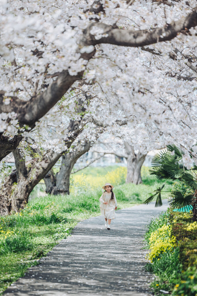 Since the Somei-Yoshino cherry trees are in bloom far and wide, including them in the frame will add a sense of depth to the photo, which is recommended.