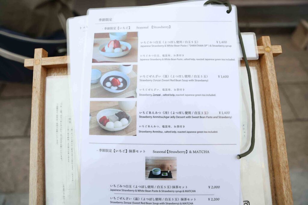 The menu featured shiratama topped with fresh strawberries and sweet red bean soup with strawberries—both looked irresistible.