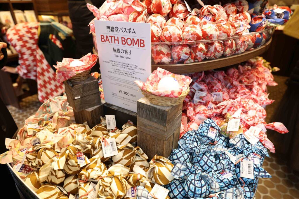 Although the bath bombs themselves seem to be uniformly white, they are wrapped in various traditional Japanese patterned fabrics, making each one feel unique.